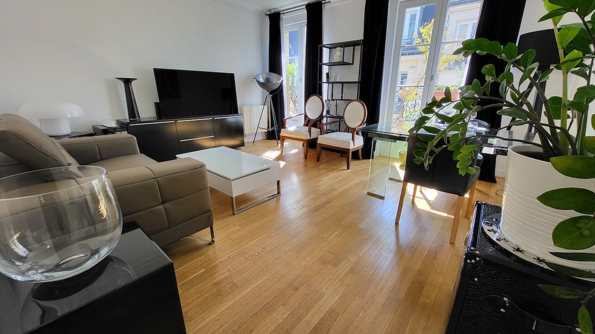 Spacieux appartement 2 chambres 70m2 avec balcon filant refait à neuf par architecte au cœur du 17eme entre La Plaine Monceau et Batignolles. Tout confort, idéal pour 4 personnes. 4eme étage avec ascenseur, très lumineux, grande baie vitrée avec double vitrage dans toutes les pièces. Salon climatisé, cuisine américaine toute équipée, machine à café à grains. Télé et wifi. Les 2 chambres et le grand salon ont une magnifique vue sur le prestigieux Boulevard Pereire, très arboré et sans vis-à-vis.