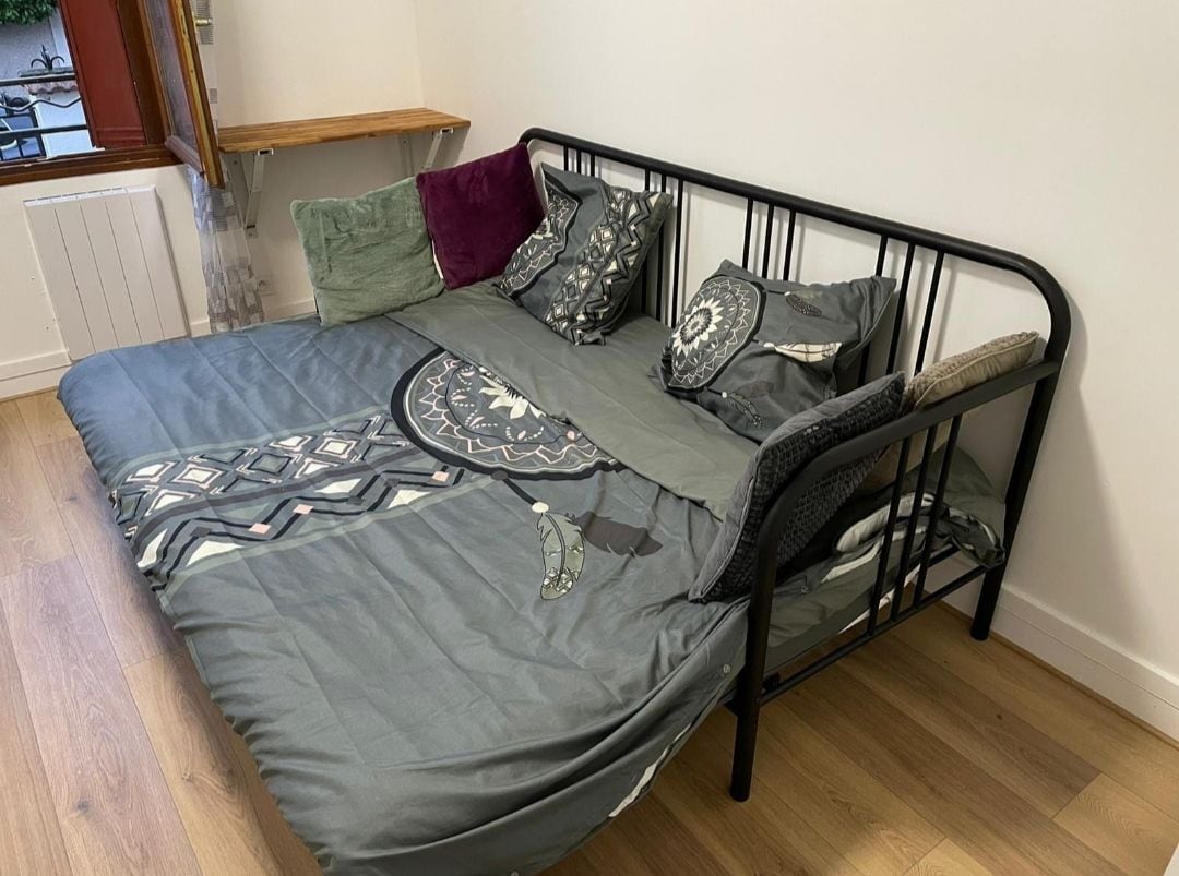 Tiny logement (10m2) paisible et central. Bien agencée, l'essentiel y est. Évidemment plus spacieux à 1-2 personnes qu'à 3 personnes (J'ajoute alors un 2e lit, ce qui supprime l'espace bureau). Donnant sur une cour. Calme. Poussette et vélo possible Au 1er et dernier étage sans ascenseur, 1ère porte à droite (paillasson avec écrit "Bienvenu")