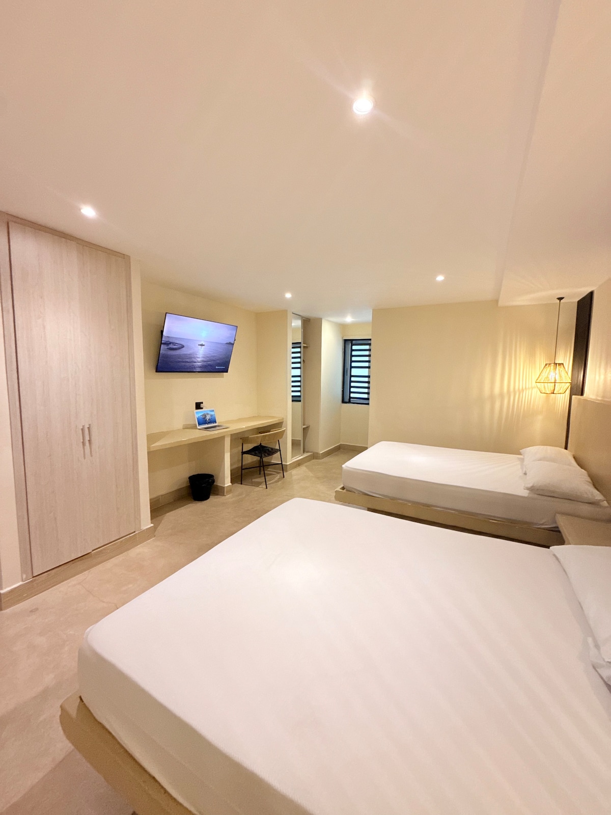 🌴Hospédate en un estudio espacioso y confortable, ideal para familias pequeñas o grupos de hasta 4 personas. Equipado con dos camas dobles, aire acondicionado, ventilador, wifi, smart TV con Netflix, baño privado con agua caliente y cocina completa. Espacio moderno y funcional en el corazón de Santa Marta.