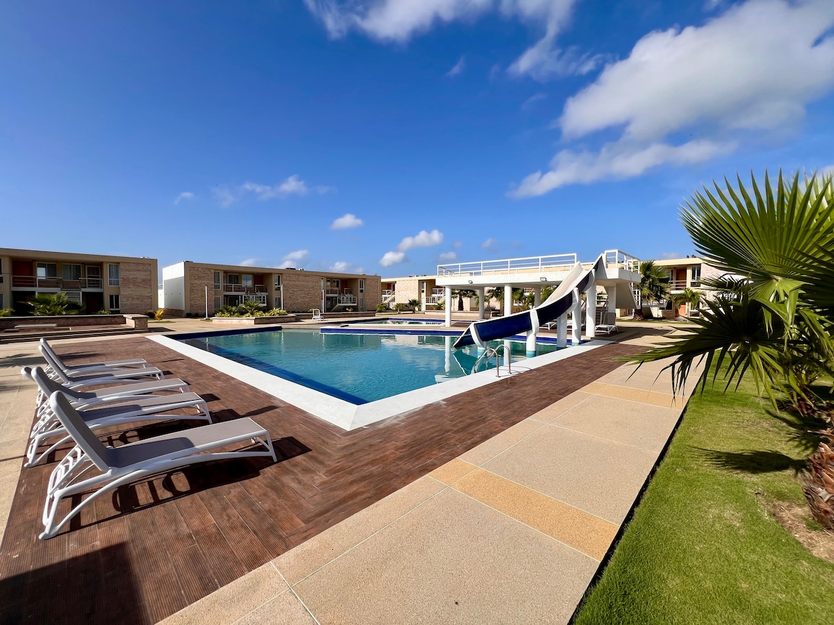 "¡Bienvenido a tu oasis frente al mar en Airbnb! Disfruta de 2 piscinas al aire libre, una para adultos con cascada y tobogán, y otra para niños, además de 2 parques infantiles en excelentes condiciones. También tenemos una cancha de bolas criollas y parrilleras disponibles. Con vigilancia las 24 horas, tu seguridad es nuestra prioridad.