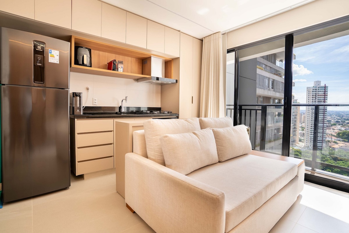 O Studio no melhor do Bueno, muito bem decorado, confortável, aconchegante, em um edifício moderno e muito seguro. O espaço possui vista livre para o parque Vaca Brava, e também para um por do sol incrível. Estamos ao lado do Goiânia Shopping, Supermercado Pão de Açúcar e Bretas. Conta também com várias opções de gastronomia (bares e restaurantes) facilidades ao redor (bancos, farmácias, padarias, academias, colégios etc)