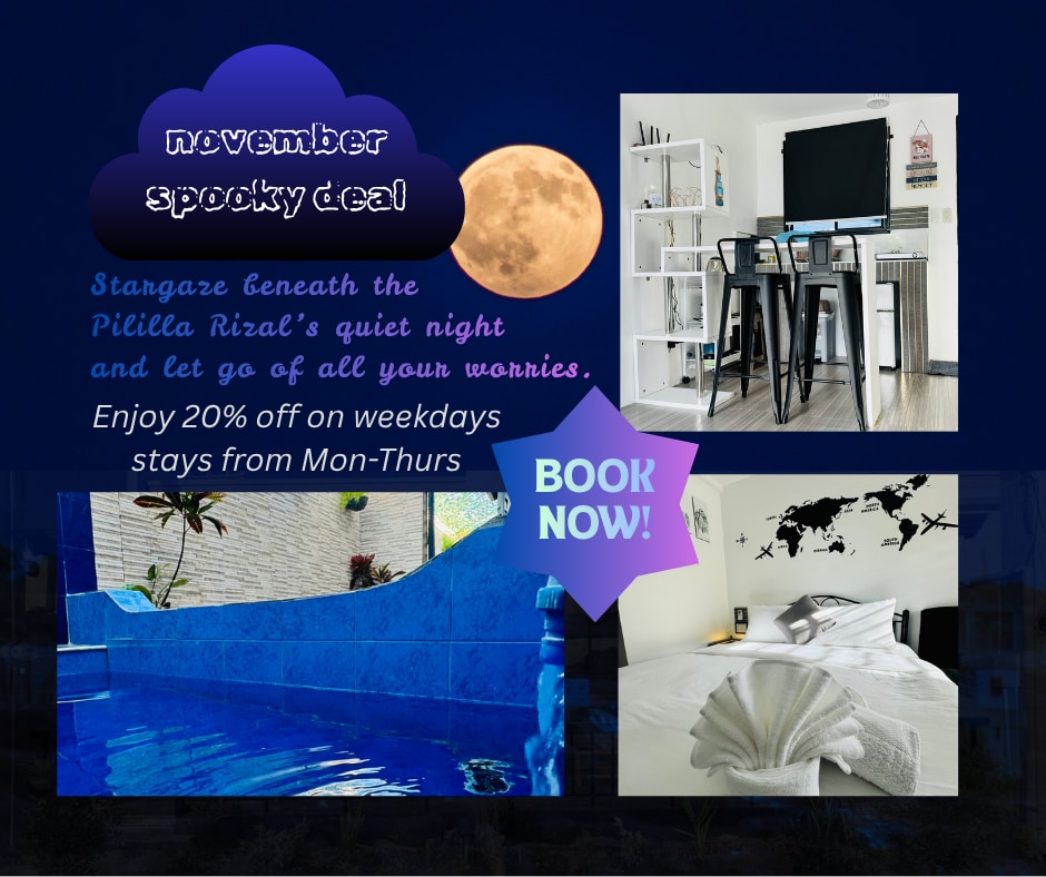 Find rest at The Nook at Hiraya, a quiet Antipolo retreat with breathtaking views and exclusive use of a private pool. Perfect for pausing after a busy week, spending quality time with loved ones, or hosting intimate occasions, our cabin offers seclusion, simplicity, and a welcoming space to recharge—just an hour from the city. Come and experience your Antipolo getaway!