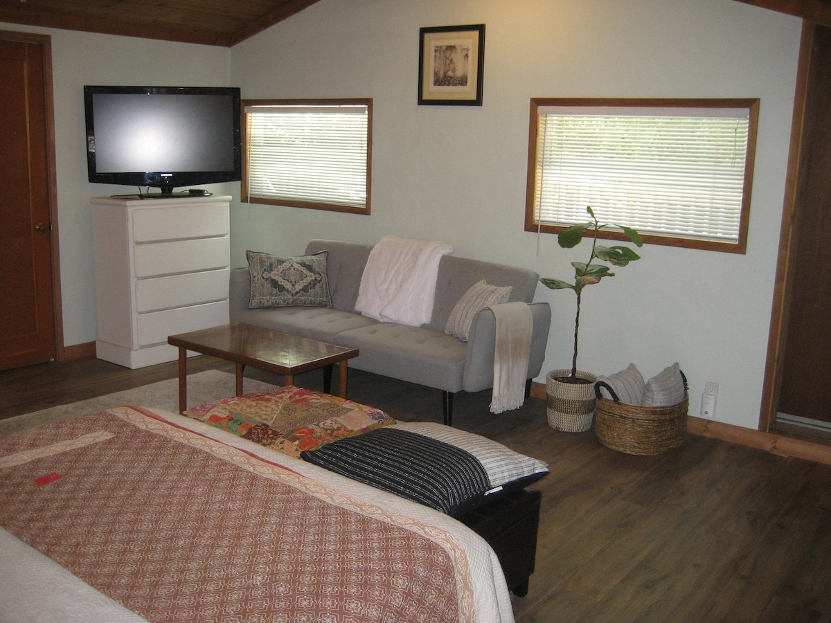 This light and airy hideaway was designed and built by the host incorporating her own handiwork in art and furnishings. Initially a granny flat, it's been transformed into a comfortable and spacious hang out. Its central location makes it ideal to explore the area. There is plenty to do on site; barbecue, play corn hole or horseshoes have fun with games and cards kept in the hall, enjoy the pool and hot tub in the warm season. May to Sept. The twin beds can be easily configured to a king bed. Price includes a 13% local occupancy tax. Your cottage opens up to the pool area which maybe available during the summer months but not guaranteed as this pool is too deep for kids to stand in. There is also a hot tub open from March to Dec. So the key to open the pool is subject to conversation. The pool is shared with us. No parties please. This is a non smoking property. We love dogs but we can not allow pets brought in. We have a large dog and cats. We kindly ask for slow driving up and down driveway as the animals are slow to move as they own the space. These are accommodations you wont find at a hotel. We are not one, this is our home we are opening to share with you. We are next door most times if you have any questions otherwise we will respect your privacy. The guest house sits on three acres with the main house where the host lives with her husband. It is just one and a half miles to the freeway and town. Four minutes to restaurants and grocery stores. There are chickens, 2 baby gosts, and a rabbit on the property along with cats and a large dog, Jules, who is sure to greet you. The pool will be opened to guests that can swim only as the shallow end is quite deep. Opened when the temperature increases in the summer months. A cold pool is no fun to swim in. The hot tub is open in March to Dec. Contact hosts if plan to use.