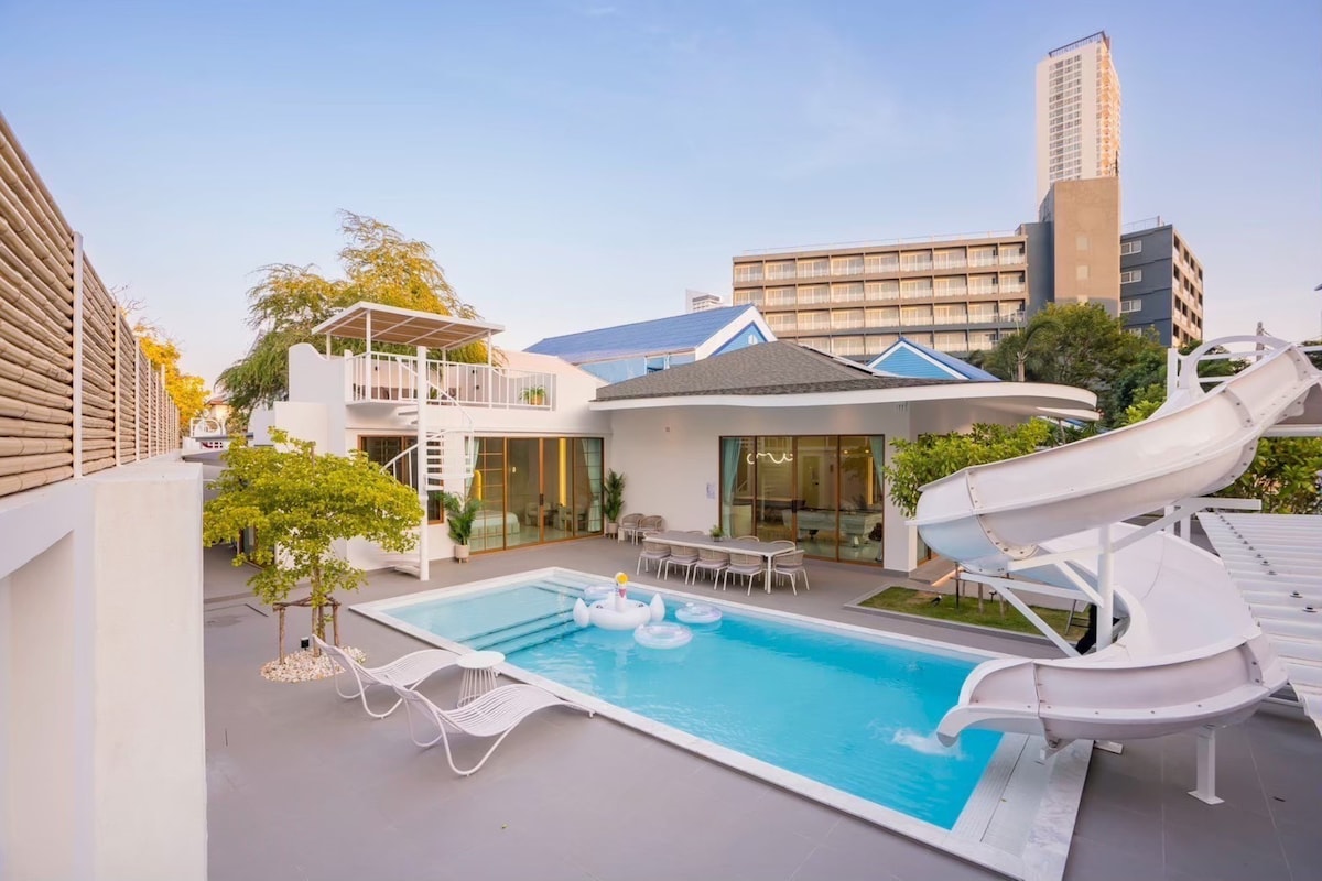 TML泰美丽高端民宿旗下新产品,现代设计与热带风情完美融合,为您打造极致私密的度假天堂。 别墅亮点: 占地1000平米,建面800平米,宽敞奢华的起居空间,挑高客厅、全景落地窗、KTV包房、泳池及桌球台,配套措施齐全。 私人泳池:独享滑梯长形泳池、户外躺椅及就餐区,尽享日光浴或星空下的鸡尾酒派对。 顶级配置:全高端厨房设备、进口卫浴品牌、豪华KTV包厢及户外健身房、桌球台,细节处处彰显品质。 尊贵服务:24小时管家服务、每日公共区域保洁(免费),满足您对奢华生活的所有想象。 位置优势:距离中天海滩13分钟车程、距离大螃蟹网红餐厅11分钟车程,距离老虎园、射击场、四方水上市场等多打卡景点均8分钟以内车程,别墅周边十分宁静,动静皆宜。 无论是家族度假、商务接待,还是追求独一无二的旅居体验,这里都将成为您在芭提雅的完美行宫。 预订即享:芭提雅定制行程规划专属礼遇 !