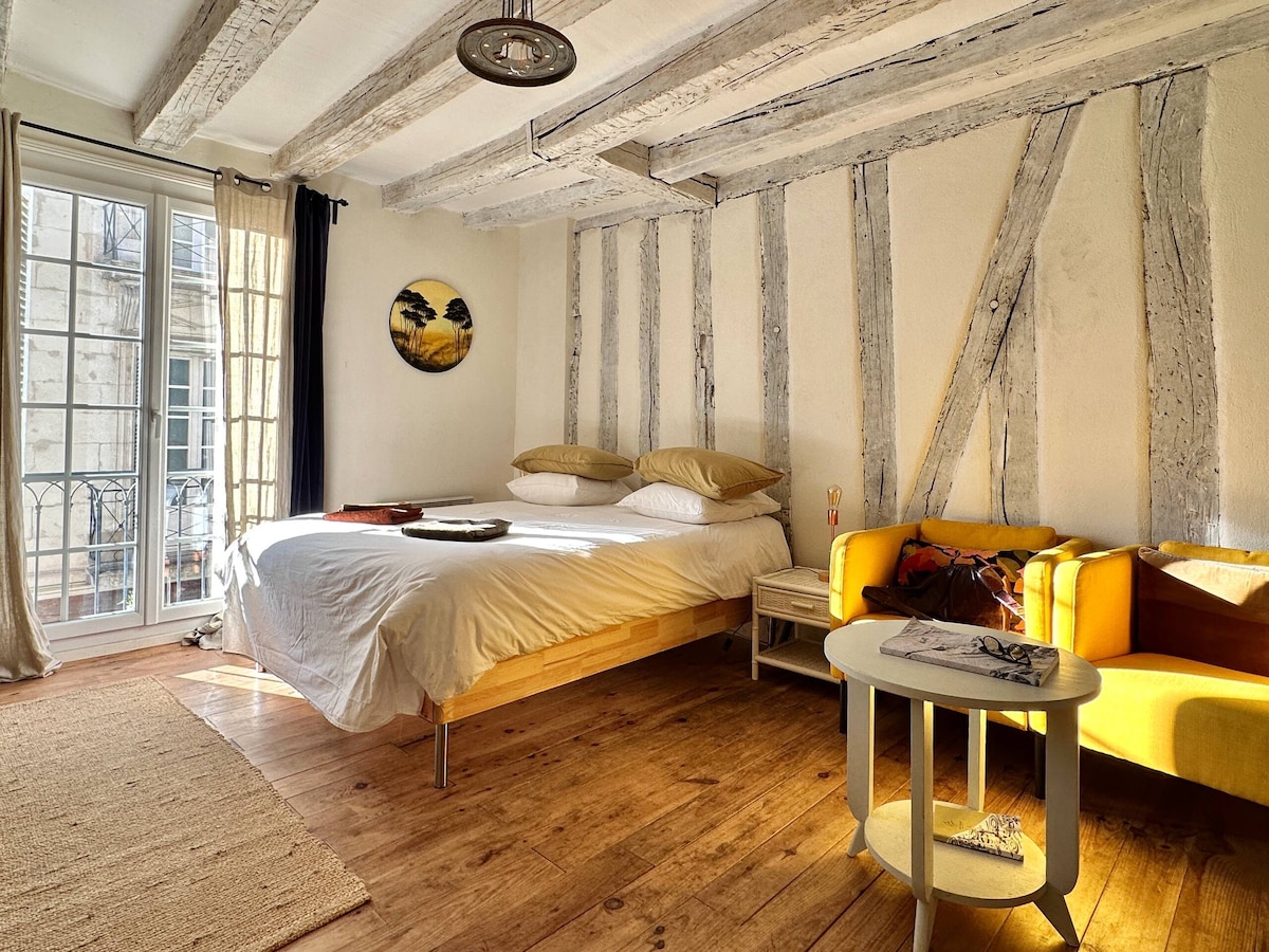 Au cœur du quartier Historique de la Cathédrale Saint Gatien et au sein d'une bâtisse en pierre de taille et colombage du 16 eme siècle, le RUDELABAR est un lieu de vie aux couleurs apaisantes : blanche et noire mêlées au naturel du bois. Baigné de lumière entrant par une large fenêtre qui surplombe les terrasses des belles demeures avoisinantes du quartier du palais des beaux arts. Avec Pour la douceur de votre séjour dans ce lieu calme, un grand lit de (160/200) au matelas très confortable
