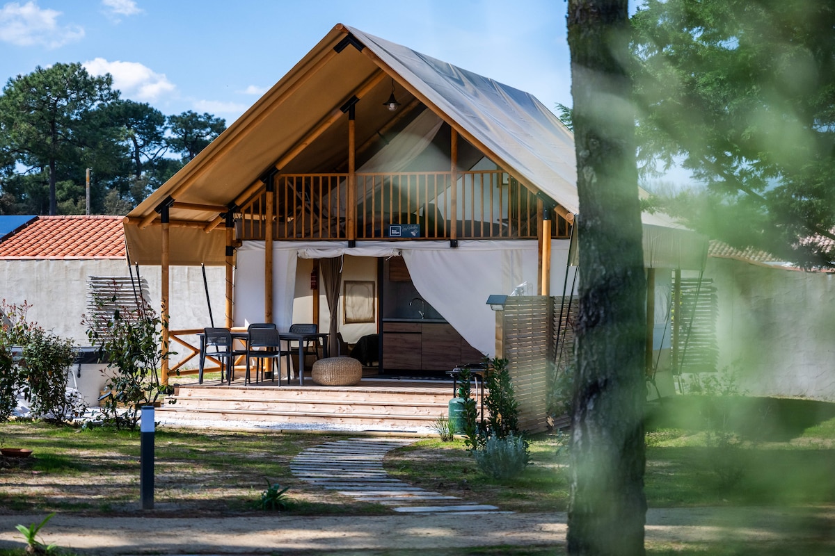 Laissez-vous bercer par les sons de la foret et du cours d'eau, dans ce logement unique. Ce camping de haut standing vous charmera par son confort mais surtout par son cadre naturel d'exception. Tente de 20 m2 avec un vrai lit de 160 dans une ambiance bohème feutrée. Sanitaire privatif. Petits déjeuners inclus.Un brasero est à votre disposition (hors période de sécheresse), pour de douces soirées. Un accès d'une heure au jacuzzi principal du domaine peut-être ajouté en option pour 20€.