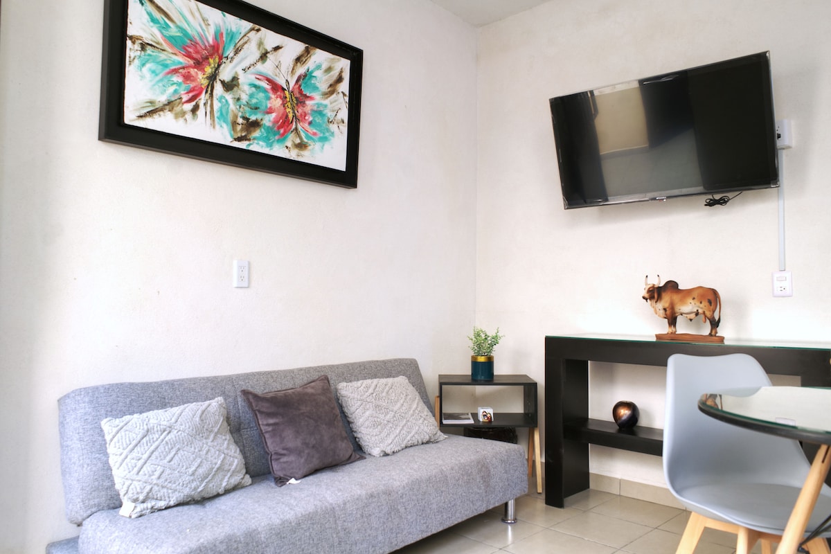 Espacio limpio, agradable, no se debe fumar dentro, está muy bien ubicado. Se aceptan reservaciones por 2 noches mínimo. Se limpia y se sanitiza cada vez que se renta . hora de llegada flexible. hora de salida flexible. NO HAY COCINA, SOLO FRIGOBAR,PAR DE SARTENETAS ELECTRICAS, MICROONDAS, VAJILLA Y ALGUNOS UTENSILIOS.