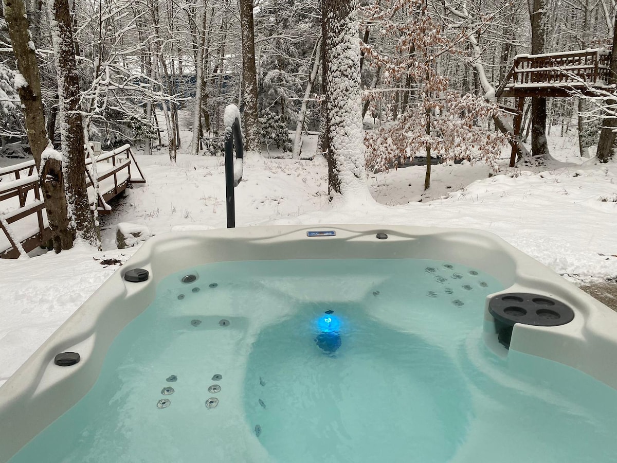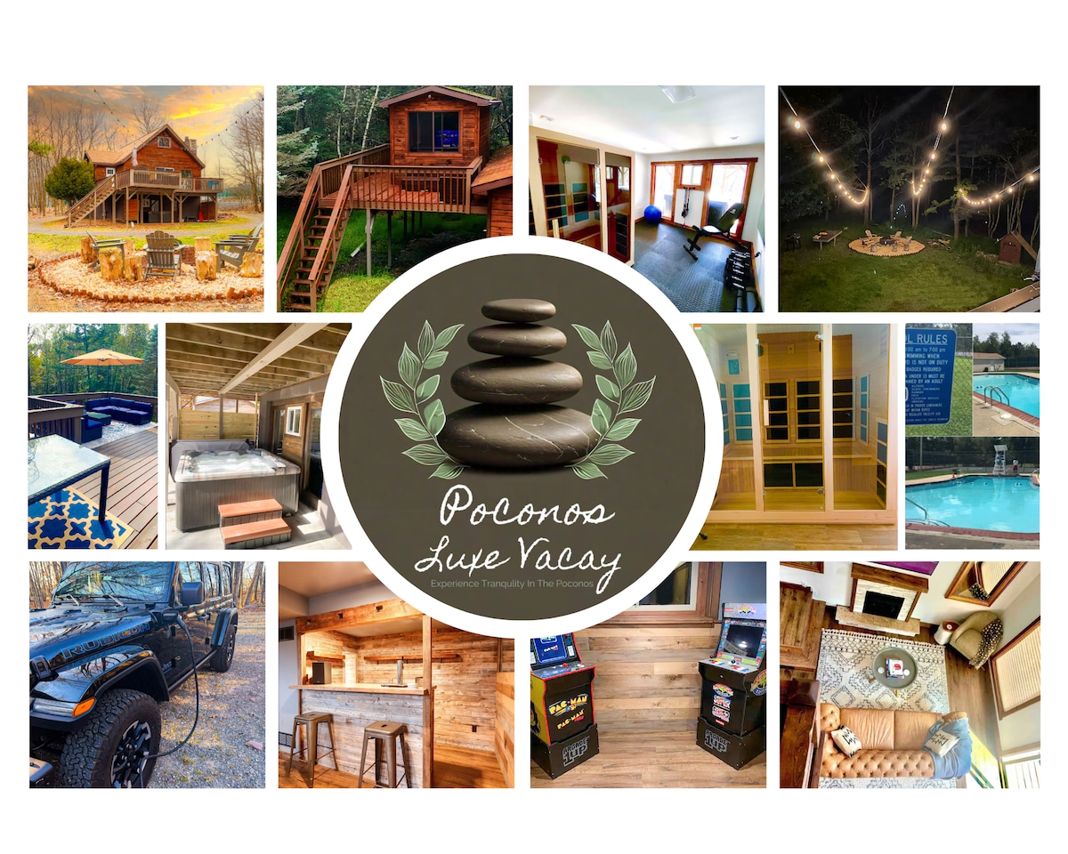New 7 SEAT HOT TUB! In the heart of Pocono Mountains a newly renovated, modern, spacious & family-friendly chalet in an amenity filled community Private 3000sqft 4bed3bath home located on 1.5acres backing up to a nature preserve Enjoy the sauna, hot tub, game room, fireplace, fire pit We are in a community with 5lakes, 3beaches, fishing lake, 2pools, playgrounds, tennis & basketball courts Minutes from bird watching, hiking, wineries, skiing, indoor water parks, golfing & casinos