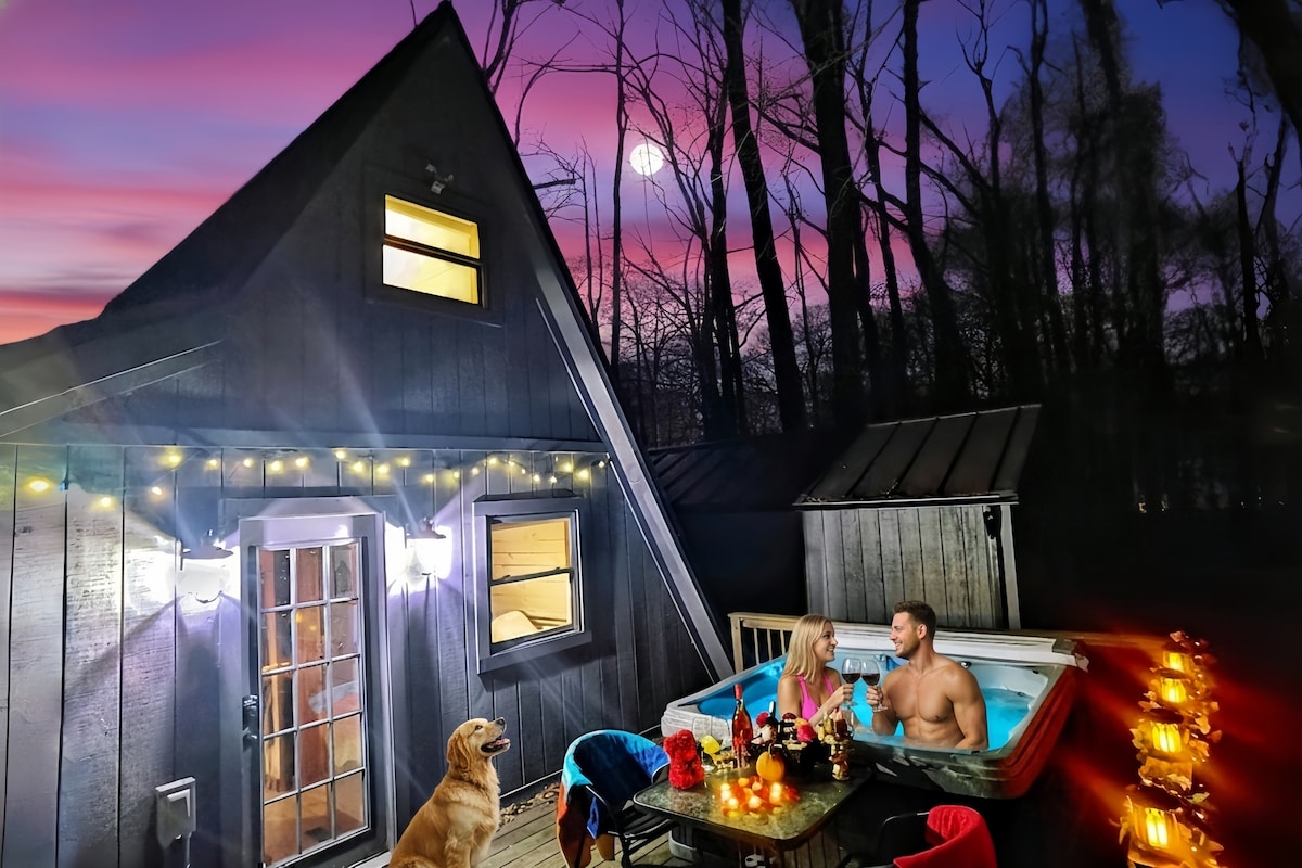 A truly unique stay in the Pocono Mountains, home to rolling mountain terrain, breathtakingly beautiful waterfalls, thriving woodlands, + 170 miles of winding river. Created with the “ultimate night in" experience in mind, guests can sip wine under the stars in a private hot tub, + enjoy movies on their own 135" movie screen equipped w/ the world's first LED 4K gaming projector. Enjoy themed bedrooms and experience a stay where the forest takes you away as you stay in ultimate comfort + luxury.