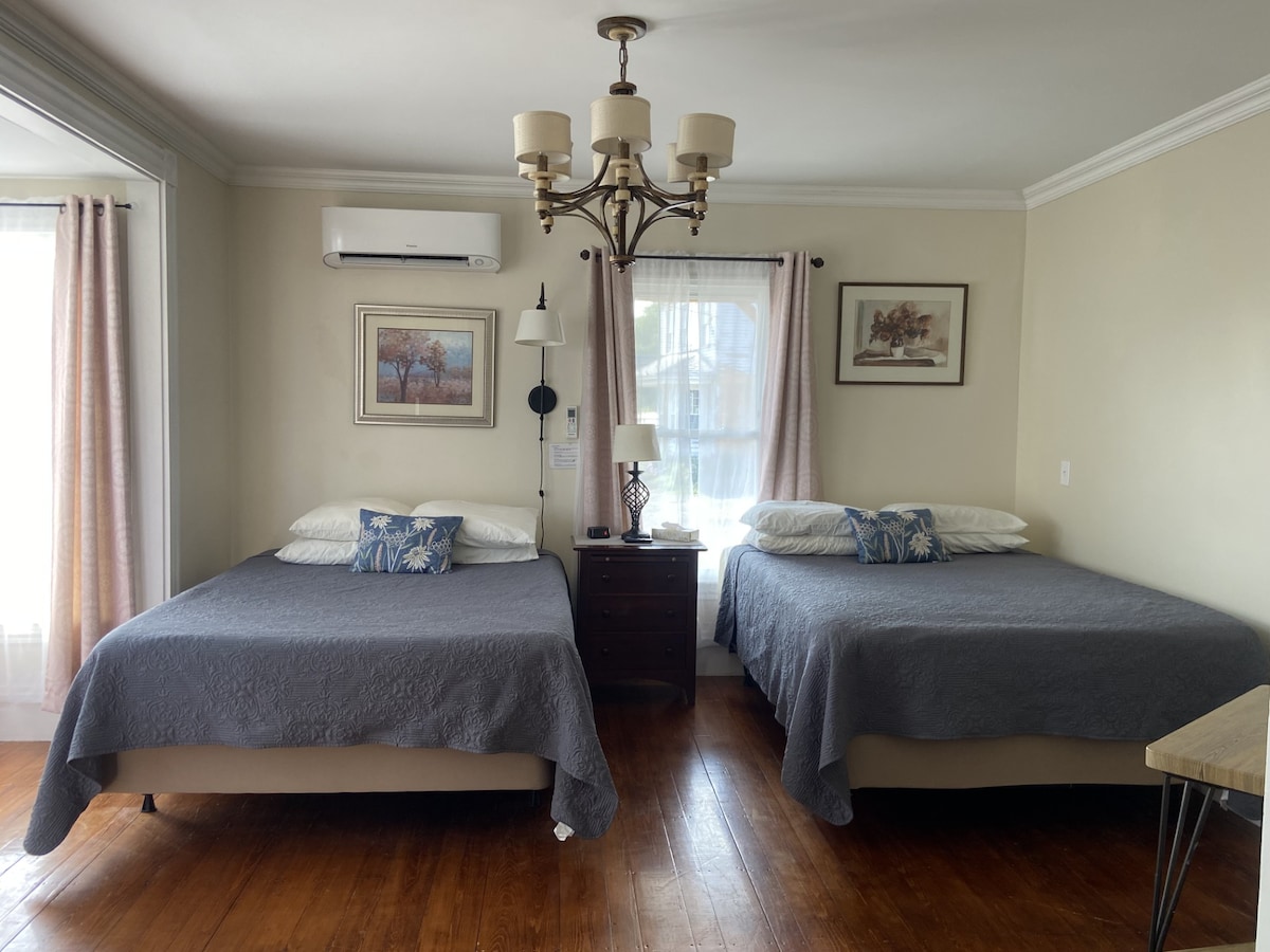 The Mill Inn is a boutique hotel in a renovated mill located in the heart of Dover-Foxcroft, Maine. Room three is a second floor room with two queen beds offering partial river views accented by charming decor with a nod to Maine culture. The Mill is a 60,000 square foot historic mill complex that was renovated in 2015 into a mixed-use building with residences, office space, and a boutique inn. While closed during Covid, the Mill Inn reopened in the fall of 2021 under new management.