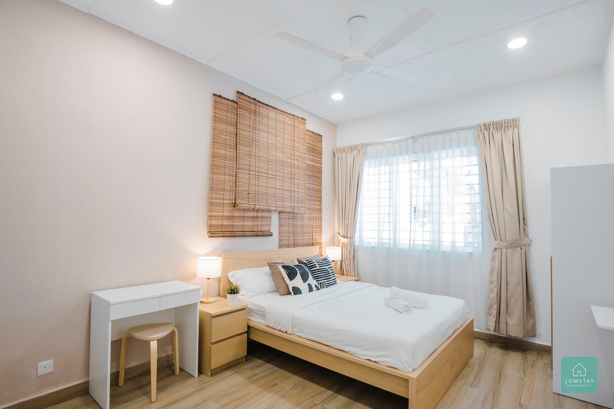 Renovated 1-storey house with FREE wi-Fi! Your whole family (max 12) rest comfortably in 4 fully air-conditioned queen size Japanese Tatami bedrooms with 3 full bathrooms. A U-shaped bar table open kitchen (air conditioned) with fridge, induction cooker and kettle for your light meal and family casual cook during holiday. The house has enough power outlets (USB charging) Remote auto gate access for 2 cars parking porch. Car wash is welcomed. Filtered water system available.