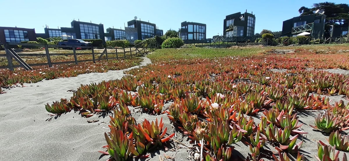 Localizada en camino a Punta de Lobos, primera línea de playa. Casa de madera hermosamente decorada, amplias ventanas, privilegiada vista para apreciar la playa y puesta de sol. Equipada full. Wifi STARLINK, horno, parrilla, cocina exterior, fogón en terraza. Ropa de cama, sin sábanas ni toallas. Amplio estacionamiento, fácil acceso. Cerca de centro comercial La Quilla y Alto Mar, Restaurantes y Supermercado. Playa Pinares destaca por arenas limpias y cercanía a todo. Basurero exterior a 40 mts