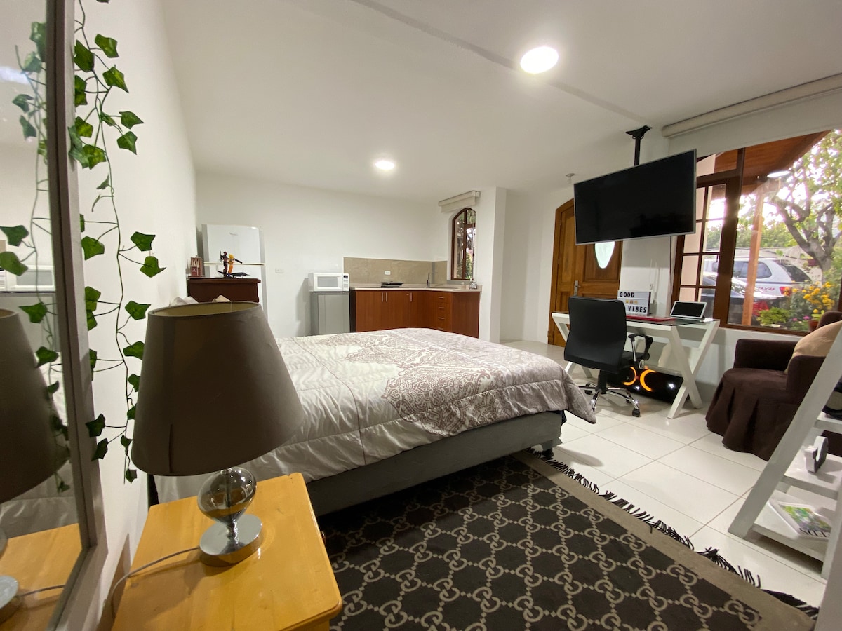 The studio has recently been up dated with sound reduction windows for your comfort. It's very comfortable, with all you migh need for your stay. Little kitchen and private bathroom. Hot water 24/7. Located on the third floor, NOT suitable for people with reduced movility. No elevator. But with a GREAT VIEW of the city and of the Andes! No garage. Excellent view, private, tranquile.