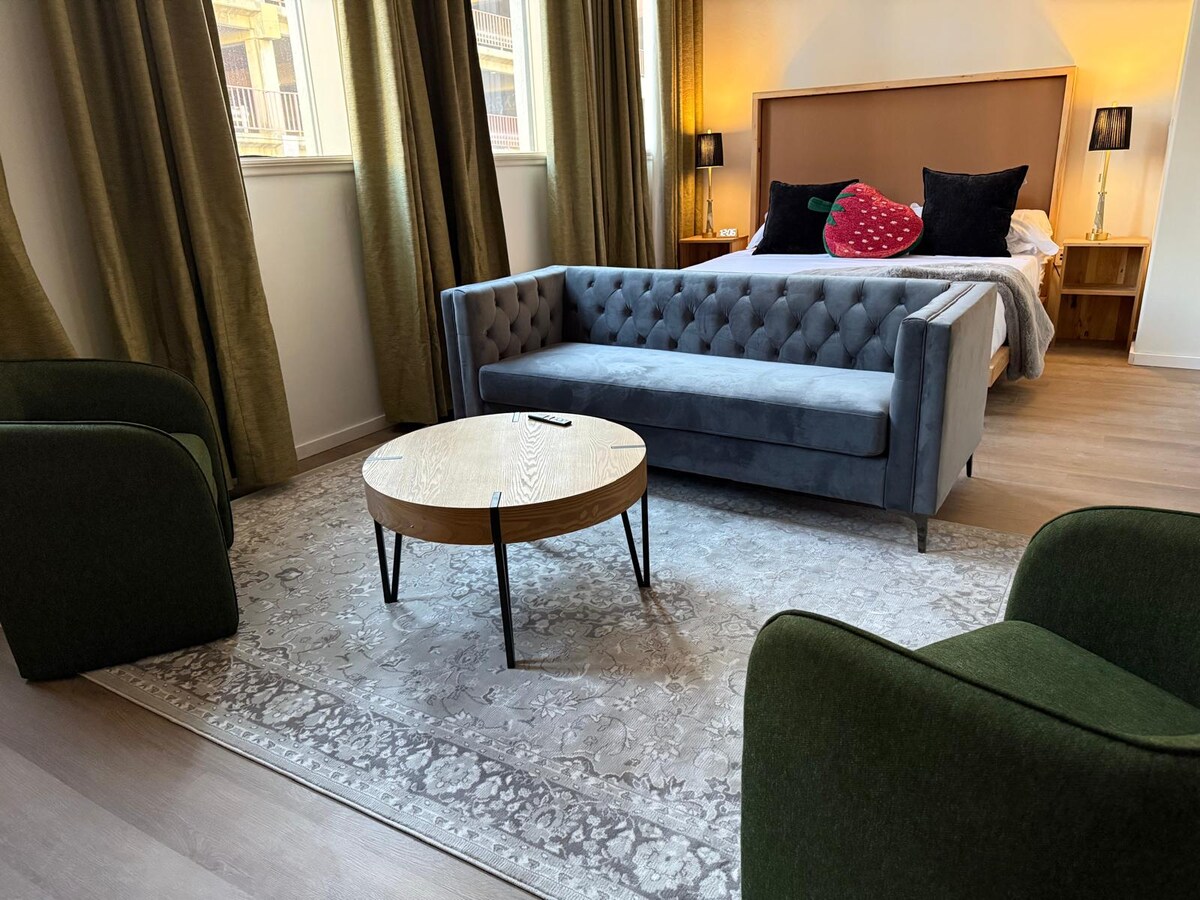 位于市中心的豪华加大双人床套房,面积600平方英尺。