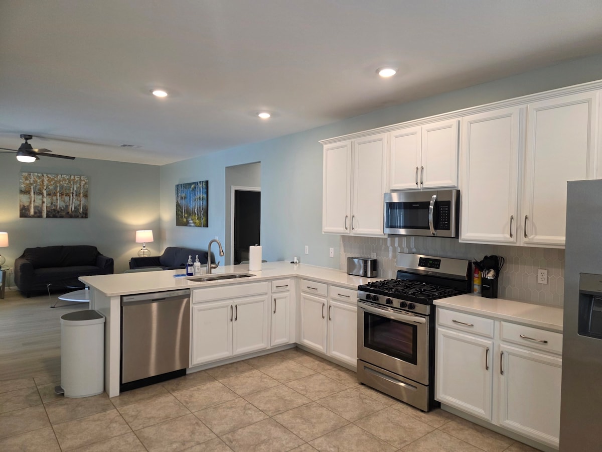 Newly remodeled 2 bedroom 2 bath home with fully equipped kitchen and washer and dryer. Home is professionally cleaned and sanitized between all guests. The property is fully fenced and has a 2 car carport detached from the home, an EV charger and a big yard with plenty of space for additional cars, RVs and toy haulers. This inviting trendy home is located close to shopping, restaurants, downtown Tucson, the Gem Show and the University of Arizona. Everything you need during your stay in Tucson!