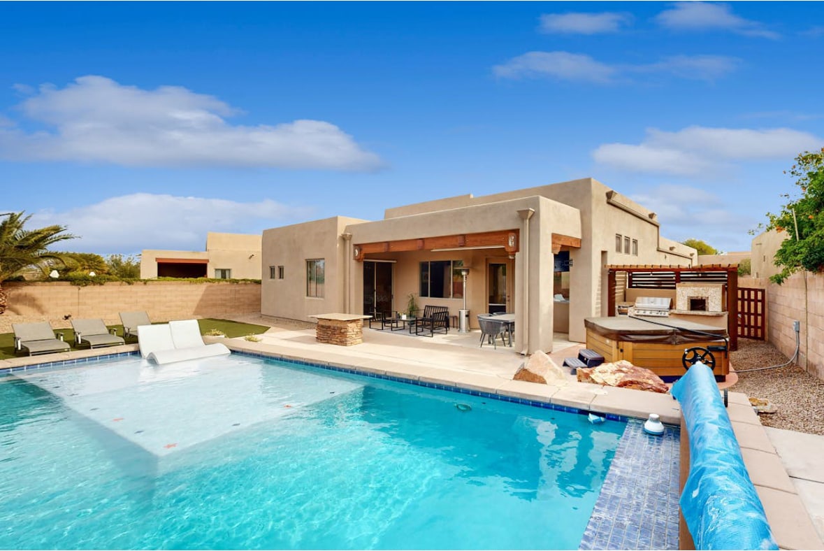 A Hidden gem in Tucson! The house is a classic adobe style Santa Fe Style Home. Enjoy all of the comforts of home, relax in the beautiful, secluded, fully fenced in back yard with a private hot tub and pool. The dining area can seat up to 8, the kitchen is fully stocked with all of the essentials. There is a small and functional office area with a printer and paper, and a laundry room. There are 3 comfortable bedrooms with smart TVs, fast internet, high quality bedding and ceiling fans.