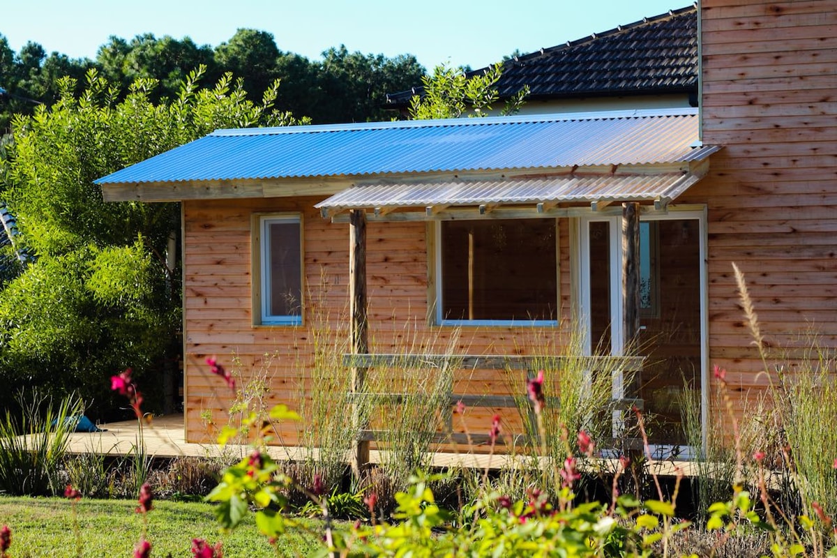 cabaña de madera en un entorno de jardín orgánico, con decoración de autor y detalles de obras de arte de artistas locales y regionales.