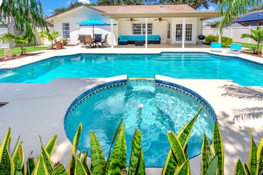 UTOPIA best describes this perfect single story VACATION HOME ! 5 MINUTE DRIVE TO BEACHES!! HUGE AMAZING RESORT SYTLE FREE HEATED POOL with LUXURIOUS PERGOLA, HOT TUB , TIKI BAR and plenty of outdoor seating perfect for soaking up the Florida sun ! Large 3 bedroom 3 bath pool home. Pool heat starts Oct 15 and runs thru april 15 seasonally for FREE( heats 80-85 degrees) large four person hot tub is hot and ready at 101° upon your arrival. No waiting on a hot tub to heat up!