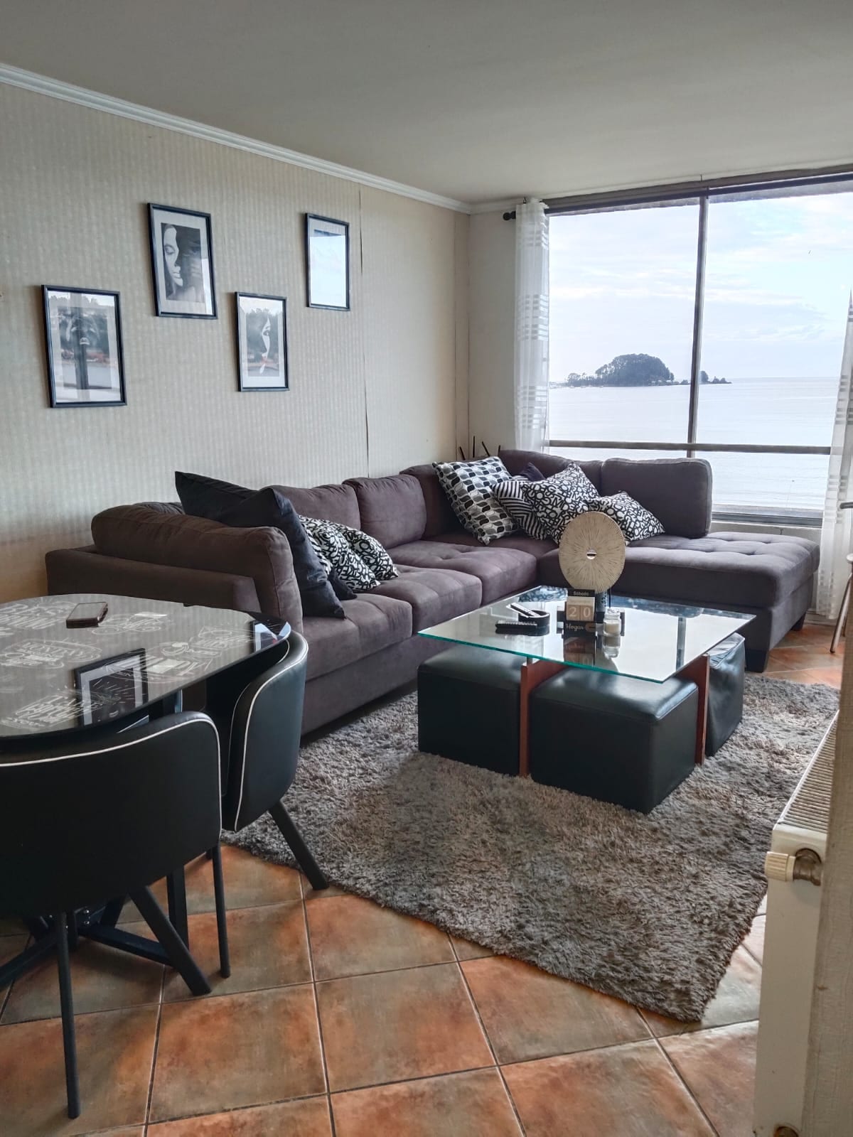 Departamento amplio con excelente distribución de espacios, vista al mar, al rompeolas y a la bahía de Tomé. Terraza para disfrutar de un buen café en la mañana al sonido del mar o con un rico trago al cálido atardecer. Cama matrimonial y dos camas de plaza. TV 32" con Cable e internet WIFI de alta velocidad. Equipado con todo lo necesario para que sea una buena estadía. Estacionamiento privado al interior del condominio.