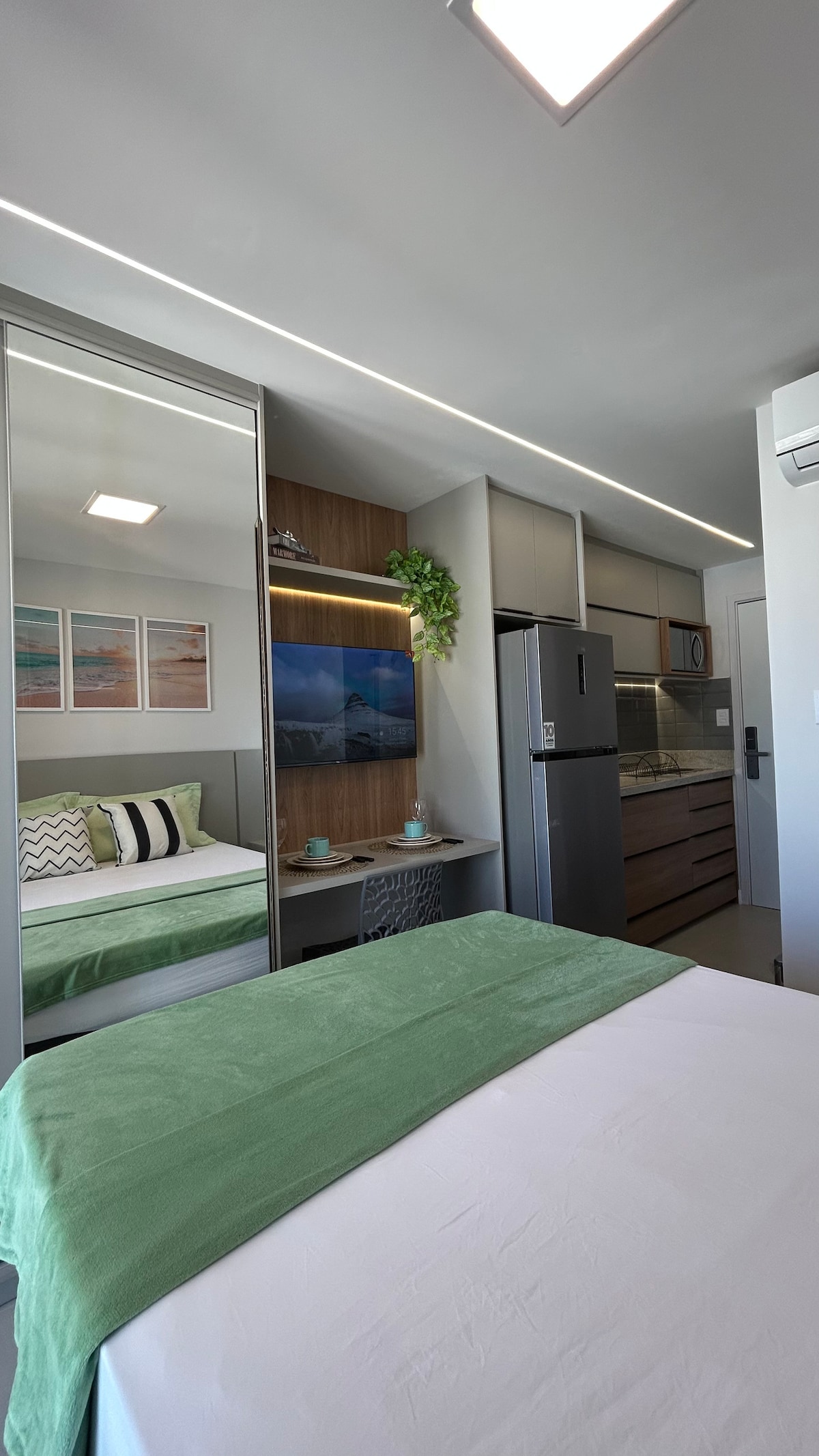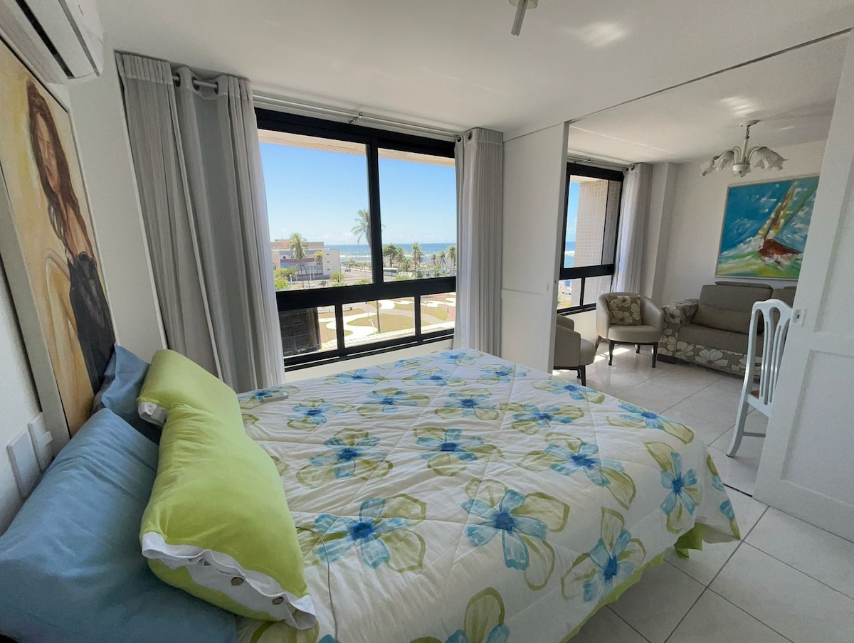 Lindo apartamento quarto e sala, espaçoso, projetado para tornar sua estadia inesquecível. Todo decorado, além de ser aconchegante, também é bem localizado, em frente à praia e próximo a bares, restaurantes e outras facilidades. Possui vista mar, bem pertinho da orla, perfeito para quem gosta de fazer caminhadas, dormir ouvindo o som do mar e relaxar durante a estadia. Climatizado, com ar-condicionado novo no quarto. O condomínio possui: - Portaria 24 horas - Piscina - 1 vaga de garagem