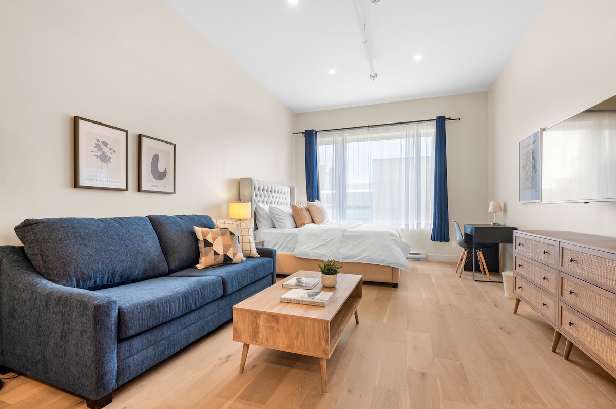 Introducing our stylish suite, featuring a luxurious queen-size bed + sofa bed to accommodate up to 4 guests. This modern retreat offers chic furnishings and upscale amenities, ensuring a comfortable stay for small groups or families. With its prime location, our suite provides easy access to Montreal's attractions, dining, and entertainment options, making it the perfect choice for your urban getaway.