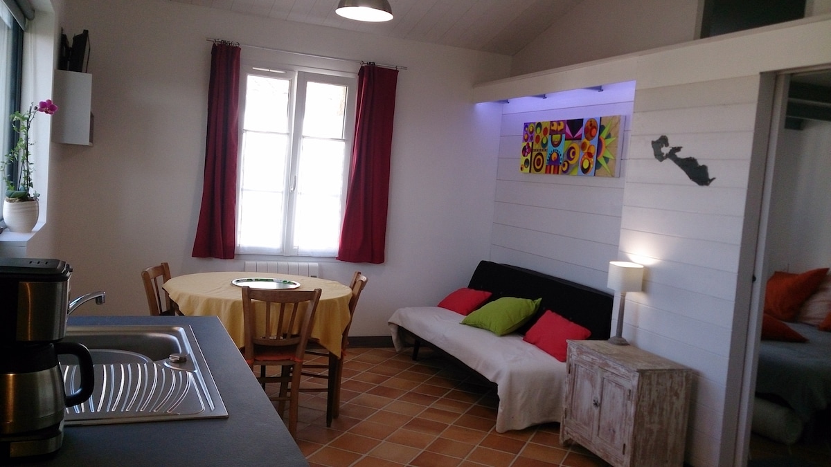 Charmante petite maison située sur la commune de Ste Marie de ré, décoration soignée.Elle se compose d'une cuisine entièrement équipée(LV +micros-onde ect), ouvrant sur la pièce de vie, avec canapé convertible (2 places) TV écran plat. Une chambre avec un lit de 140, une salle d'eau avec douche-wc