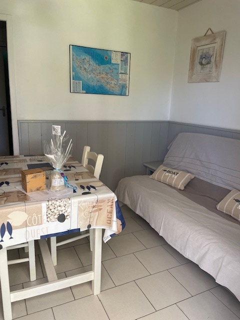 Nous vous accueillons dans ce charmant studio au cœur de Sainte Marie de Ré, proche des commodités et situé à 800m des premières plages. D'environ 22 m2, il est totalement indépendant, récemment et entièrement rénové. Autour de 2 espaces extérieurs (auvent et courette plein sud) vous disposerez d'un espace salle d'eau et d'un ensemble cuisine - salon - chambre. Le lit coffre (160x200) est fait à votre arrivée et les serviettes de toilette sont fournies !