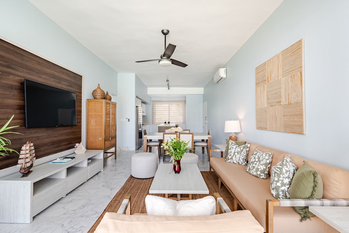 Experience style and sophistication at Mangoi 1, a condo located at the heart of Las Terrenas, just across the street from the beach and steps away from shops, entertainment, restaurants & nightlife. With the added convenience of a cleaning lady visit every other day, this condo is the perfect place for families or groups of friends looking for a beautiful and convenient Caribbean paradise getaway.