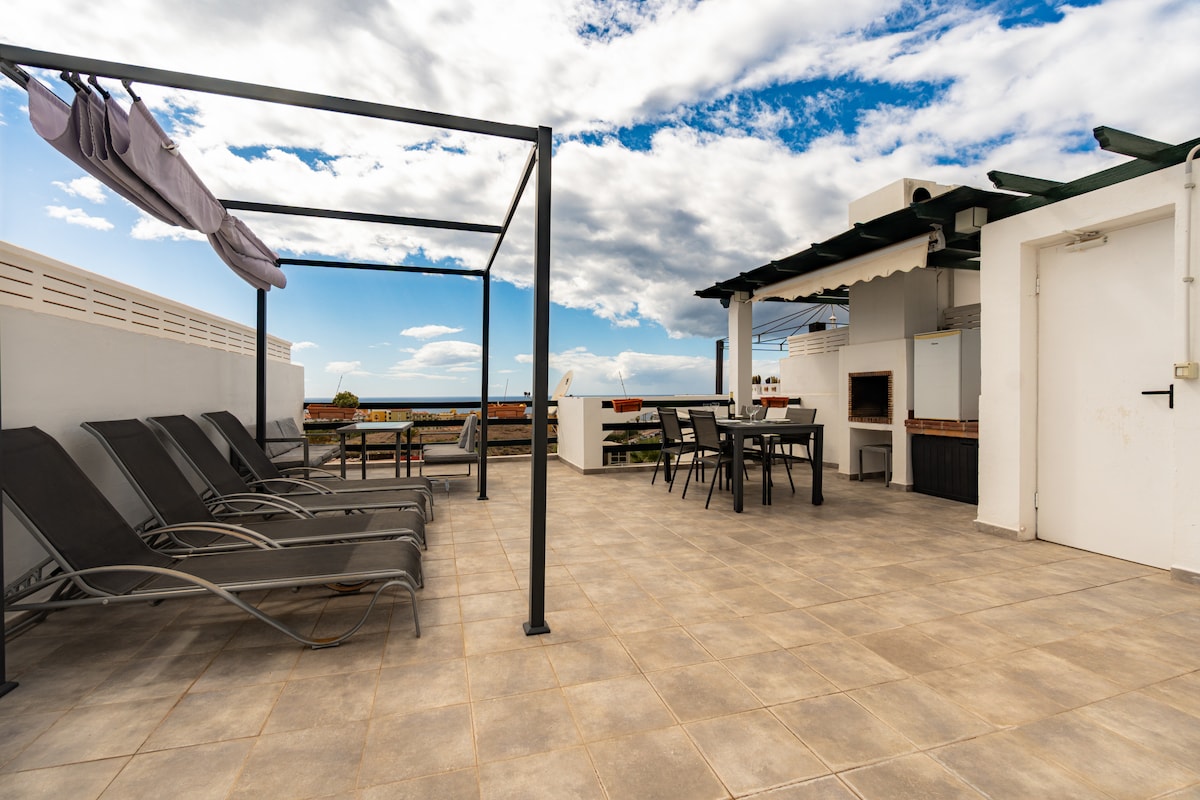 Favoloso appartamento appena ristrutturato in Playa Paraiso, una delle zone più belle del sud di Tenerife, in un fantastico complesso residenziale in pieno centro, a 100 metri dalla spiaggia, di una superficie di 60 m2 ed altri 60 m2 di fantastica terrazza privata attrezzata con vista mare e natura, composto da un confortevole salotto in stile moderno che da' sulla splendida terrazza, cucina americana, spaziosa camera da letto , ideale per famiglie e coppie , piscine e spiaggia