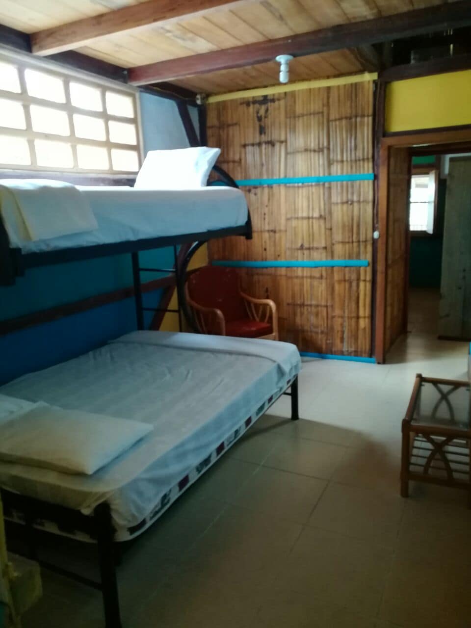 5 Double Bedrooms for up to 11 people located on the top floors of a classic Bamboo House located in front of the Beach. Private entrance, private & shared bathrooms, kitchen with refrigerator, spacious common room with hammocks and panoramic view over Mompiche bay, free Wifi throughout the place.