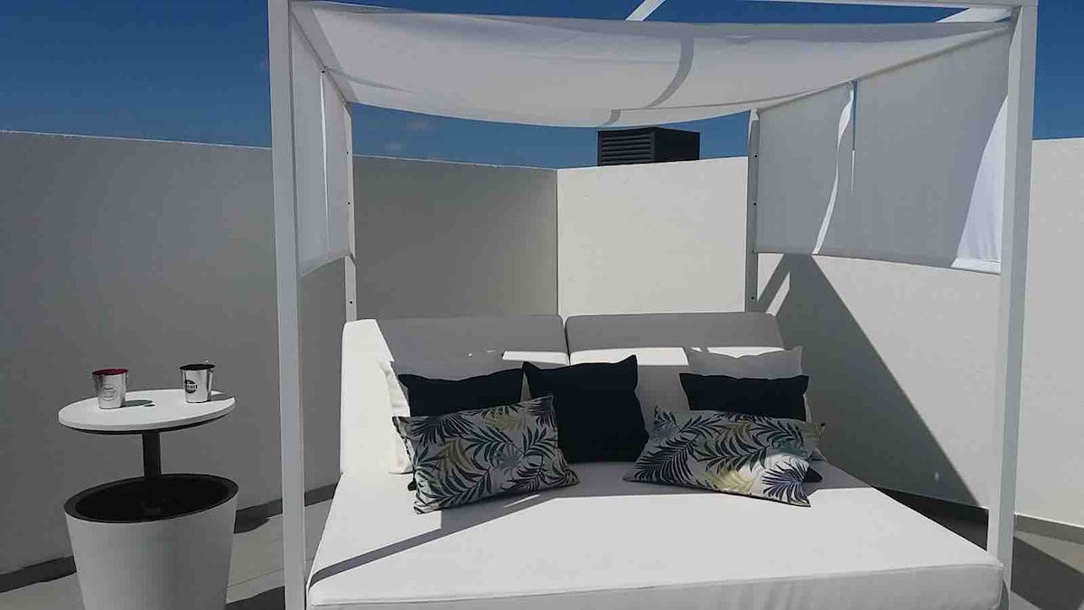 Check in at this peaceful apartment designed for couples. Enjoy stellar views from the privacy of your own roof terrace or cool down inside with central air conditioning. Furnished for both indoor and outdoor dining. There's a 4K UHD Smart TV and high-speed Wi-Fi (625 MBps). The apartment counts with modern appliances and fully-stocked kitchen and dining utensils. Two outdoor pools, a paddle tennis court, a lift, and CCTV. Free street parking in front of the building.