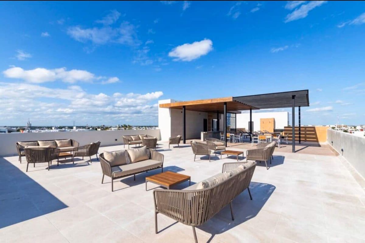 Disfruta de una experiencia con estilo en este alojamiento céntrico a 10 minutos del mar y del centro de Playa del Carmen. Este apartamento totalmente equipado cuenta con cama Queen, sofá cama, refrigerador, lavadora, Tv de 55" con Netflix, Wifi (50 megas), cafetera, horno microondas, tostadora, licuadora, plancha, cocina eléctrica y todos los utensilios para cocinar. El condominio ofrece un roof con alberca, asador, solárium y camastros, seguridad las 24 hs y estacionamiento. La mejor opción!