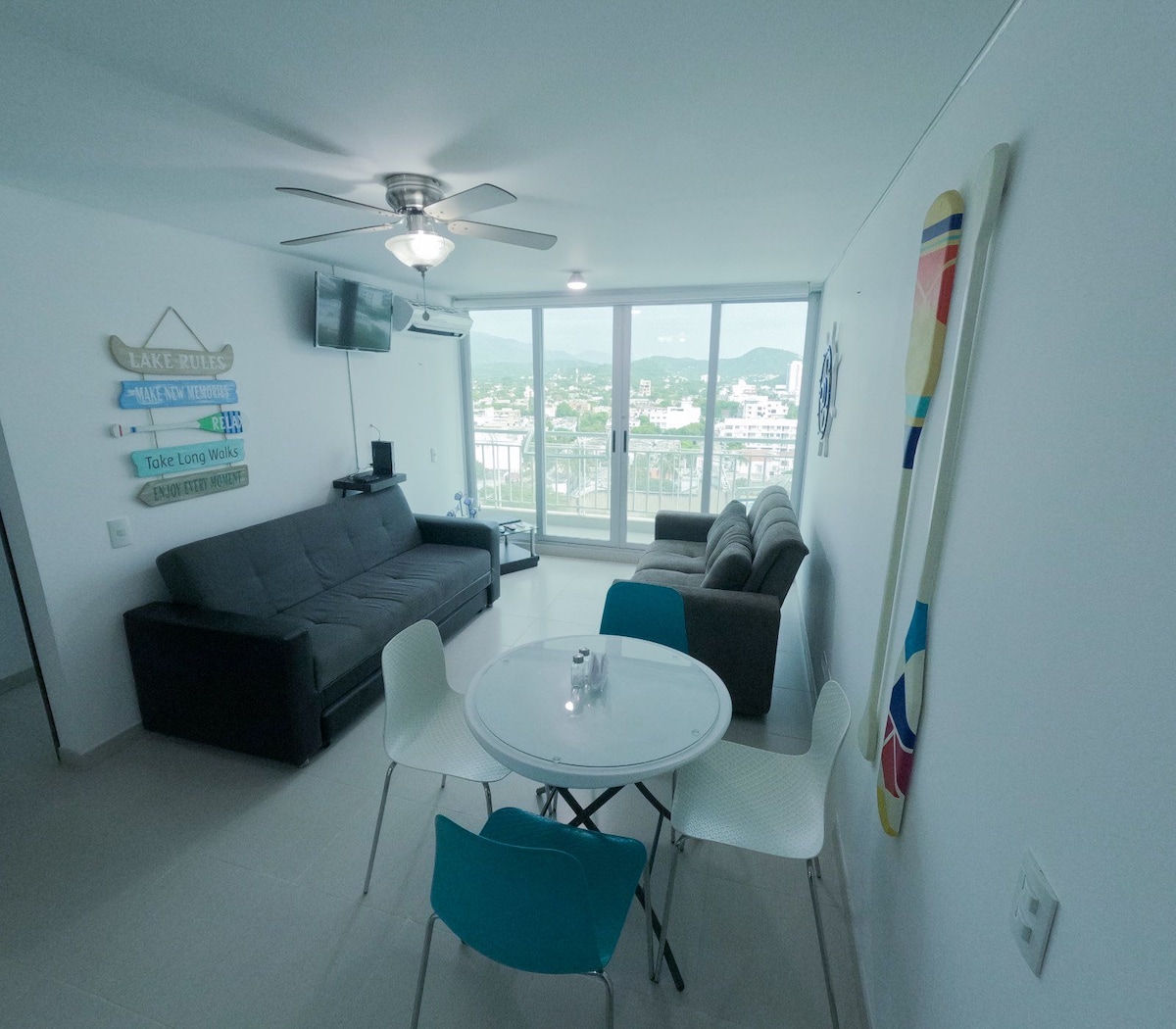 Wake up to the sound of the sea and enjoy Santa Marta’s most magical sunsets from the balcony of this bright, elegant apartment. Located on the 13th floor of the exclusive Grand Marina Apartasuites, with access to the spectacular AC Marriott hotel pool. The building also features its own gym and sauna. Modern, stylish, and full of light, with a fully equipped kitchen, workspace, fast Wi-Fi, and private parking — your perfect home by the sea.