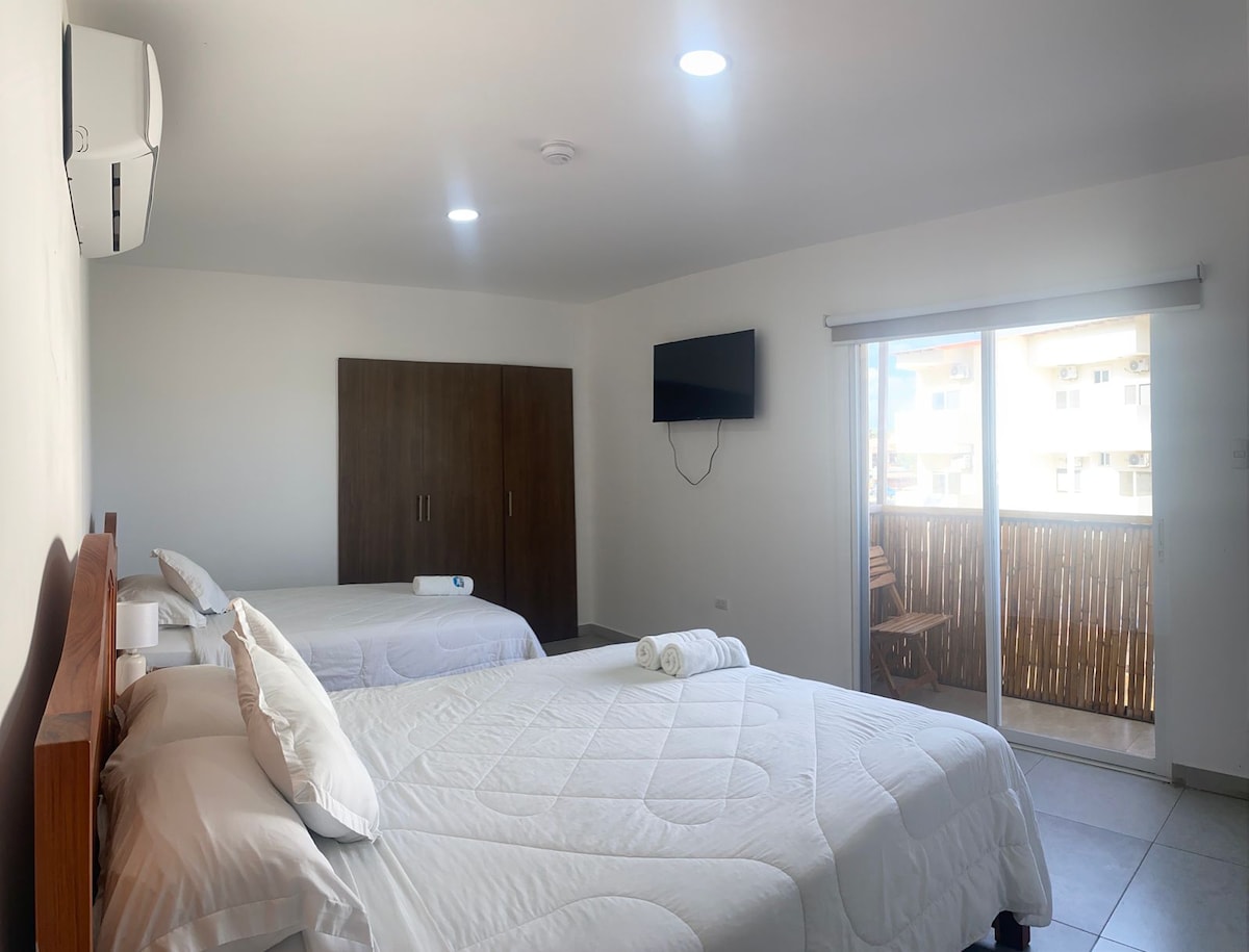 Habitación en planta baja con una cama matrimonial y dos literas de 1.5 plazas, ideal para grupos o familias de hasta 6 personas. Tiene aire acondicionado, baño privado funcional, Smart TV con Netflix, estante tipo armario y colgador de ropa. Cómoda y bien ventilada. Acceso libre a piscina, cocina, parrilla, jardines, hamacas y más. A solo 7 minutos de la playa y del centro de Montañita, pero alejado del ruido. Tranquilidad y espacio para compartir.