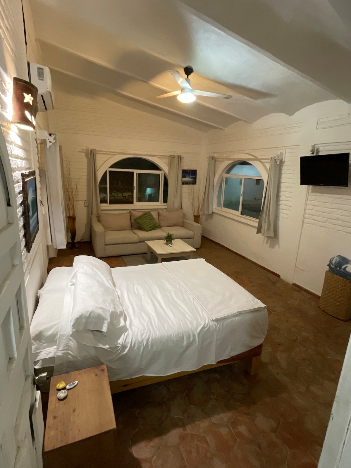 Our 800sq ft beachfront casitas are ideal for a couple, a family of three, or just a couple of friends traveling together. The casitas provide total privacy within the openness of the studio layout. The front of the casitas open up onto the patio through a huge 12-foot wide pair of French doors that bring the ocean view and breeze right into your casita. Please note our Casitas #1-4 all share the same layout & beautiful ocean view. Our gallery is a collection of images from different casitas.