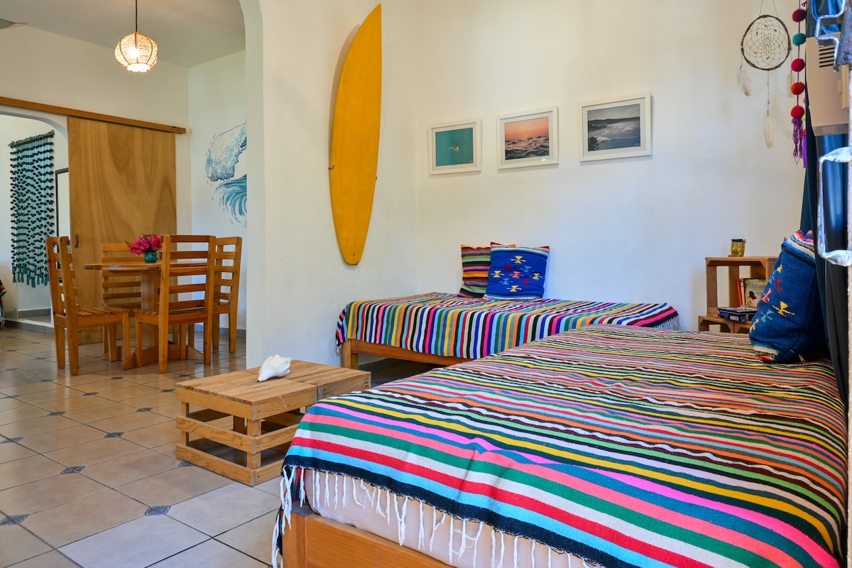 Depa amplio y luminoso en planta alta con 2 camas queen súper cómodas, A/C en la recámara y ventiladores en sala y cocina. Cuenta con cocina equipada, salita acogedora y balcón con vista a palmeras. Estás a solo 2 min de la playa y a 1 min de cafés, tiendas y restaurantes. Disfruta el patio compartido con hamacas, árboles frutales, asador y área de pesas artesanales. Ideal para relajarte, surfear o trabajar remoto con buena vibra.