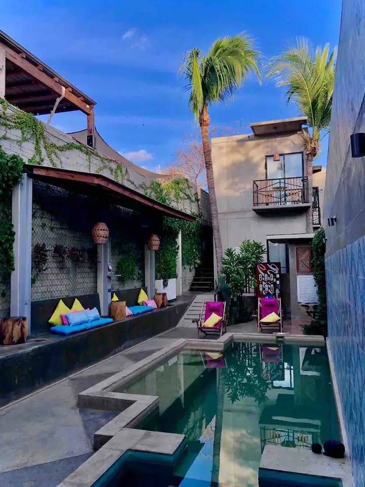 Maralagua is a beautiful guesthouse with 4 lofts in one of the most exclusive areas of Puerto Escondido: Punta Zicatela, just 5 minutes walking from the beach. Each loft has a king-size bed, air conditioner, private terrace, equipped kitchen, and full bathroom with hot water. Common areas: pool, sun deck, coworking space, and roof garden with spectacular views. High-speed Starlink internet. Located in a quiet area, close to restaurants and bars. Adults only.