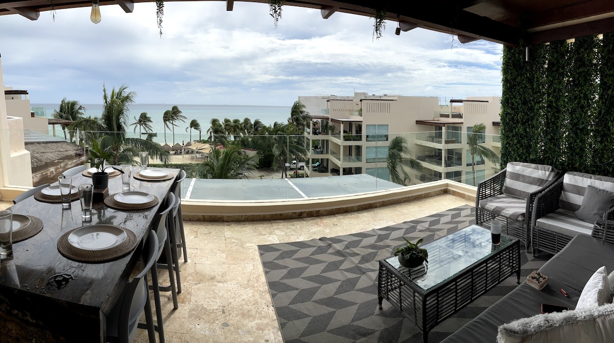 This oceanfront penthouse is one of the most sought after in all of Playa del Carmen & offers extraordinary ocean views from the main living area and private rooftop! Just steps away from the warm Caribbean waters at the luxury Elements condominiums, the only oceanfront condo complex in Playa del Carmen with its own private beach. This penthouse features its own private rooftop terrace with a custom built cool water dipping pool and has the largest private rooftop terrace at The Elements.