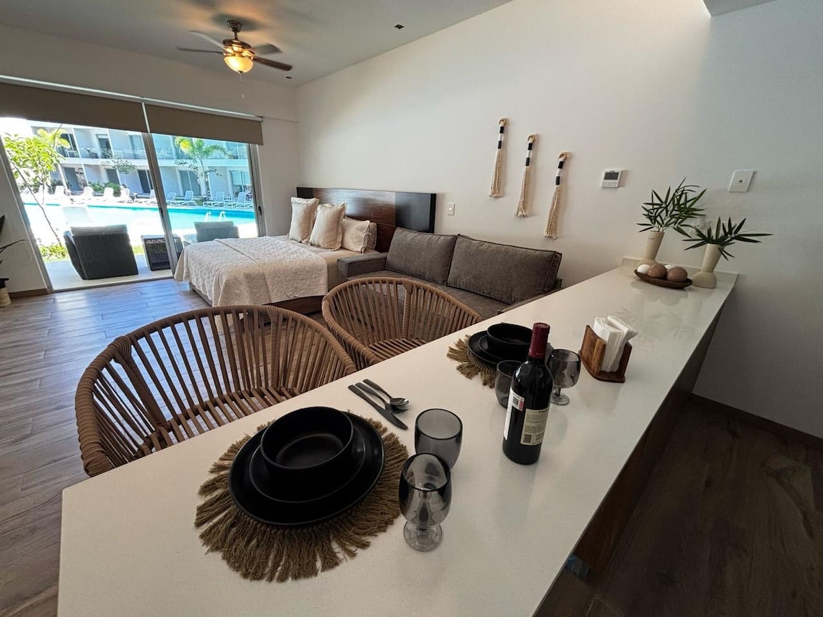 🪻A solo unos pasos de una de las playas más exuberantes y de la 5ta Avenida, este moderno departamento te brinda una experiencia sin precedentes. Reposa en una cómoda cama king, disfruta de tus pelis favoritas en Smart TV y explora tu creatividad en una cocina práctica y funcional. 🌿Disfruta de tu espacio al aire libre en un balcón privado. Y si buscas algo más especial, sube al rooftop: ahí te esperan una infinity pool, la vista parcial al mar y el radiante sol del Caribe.