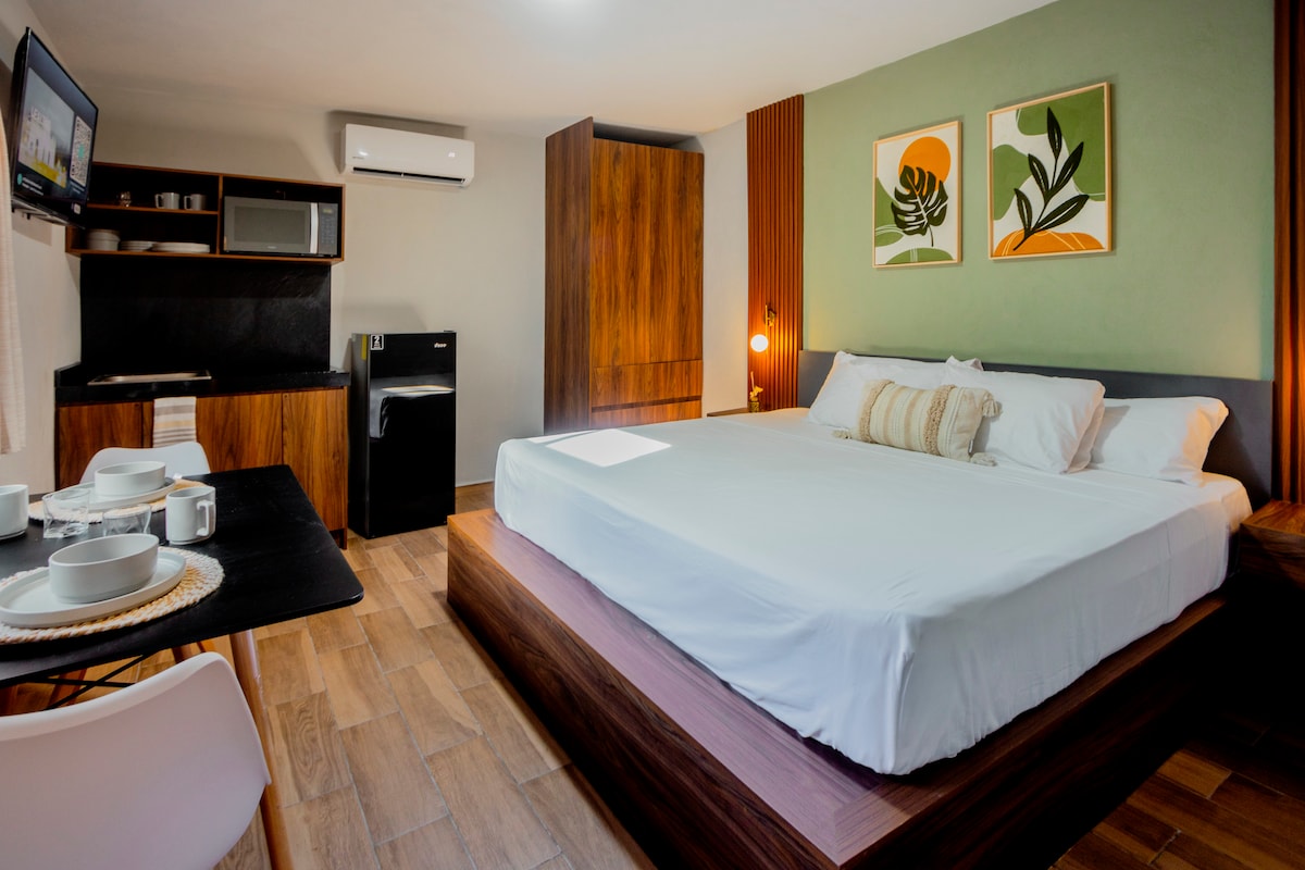 Modern and cozy loft in Playa del Carmen, perfect to relax or work from home. Enjoy a rooftop with infinity pool and green views, beautiful common areas with hammocks, and a private patio with sunlight right by your bed. Located across from the iconic Parque La Ceiba, and close to cafes, supermarkets, and public transport. Stylish design, quiet vibes, and the comfort you need to feel at home.