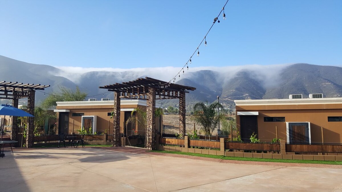 Estas habitaciones se encuentran ubicadas en el corazón de el valle de Guadalupe, dentro de un hotel boutique llamado luna Del Valle Son el lugar ideal para relajarte y despertar con vista al viñedo Comparten áreas como alberca, jacuzzi, fogatero y area común
