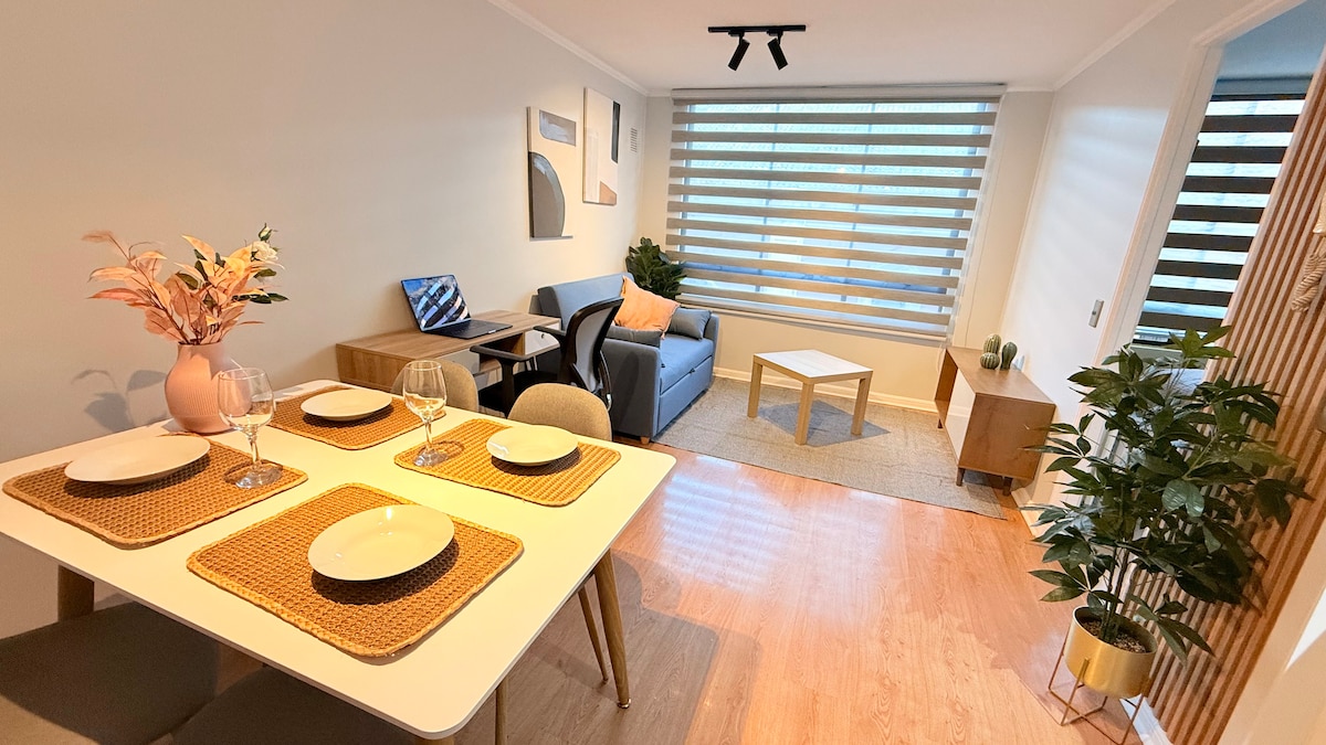 🌿 Disfruta una estadía con estilo en el corazón de Santiago. 🏡 Check-in automático 24/7 ✨ Refugio nórdico-boho con luz natural y detalles de madera. 🛏 Cama king de ensueño, sofá cama y balcón ideal para un café o vino al atardecer. ❄️ Aire acondicionado, Wi-Fi rápido, cocina equipada y lavadora privada. 🚇 A pasos del metro Santa Lucía, cafés, restaurantes y parques. 🅿️ Estacionamiento sujeto a disponibilidad. Cada detalle fue pensado para que llegues, te relajes… y respires.