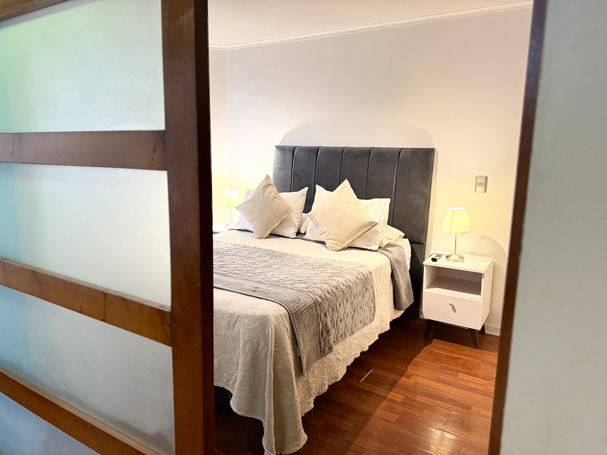 Disfruta de la sencillez de este alojamiento tranquilo y céntrico. Esta ubicado a pasos del Metro Los Héroes con conectividad a todos los lugares históricos, turísticos y de entretención de stgo. Un espacio cálido y cómodo para que 4 personas puedan disfrutar y sentirse como en casa. Estaremos atentos a tus necesidades dando respuesta oportuna para que nada te falte. Esta acondicionado con todo lo que necesitas para disfrutar y descansar en un solo lugar. Te esperamos !