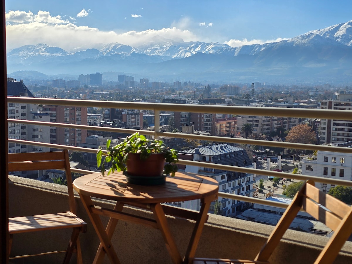 Exclusivo departamento en el corazón de Plaza Ñuñoa (a 6 minutos caminando), con estacionamiento propio incluido. Con una gran vista a la Cordillera de los Andes y con una decoración cuidada, este departamento tiene toda la comodidad que necesites: cafetera Nespresso, todos los utensilios para cocinar, toallas, TV con internet, refrigerador, microondas, calefacción, y mucho más.