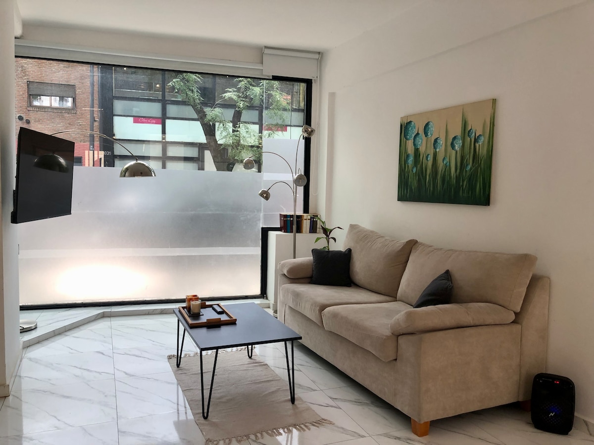 Loft apartment with design and independent entrance. Very well located in Palermo/Villa Crespo. Its own entrance from the street makes it as if it were an independent and private house. In its entrance hall there is space to store bicycles or luggage. It has a large bedroom with an exit to a very bright and airy patio. Its terrace balcony is very comfortable and overlooks the tree-lined street. Your living room is very spacious, comfortable and bright, which makes your stay very pleasant.