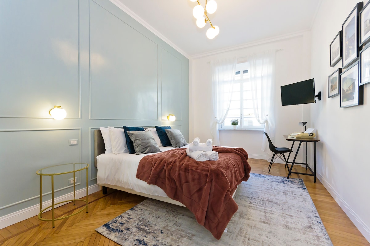 65 sm 1 bedroom flat with balcony on amazing sea view on 3rd floor (elevator) of 1908 Historical Ex Grand Hotel Miramare whitch hosted guests like Queen Elizabeth, Churchill and FS Fitzgerald! Living room w 1 double sofa-bed, 2 single sofa-beds and table for 4. Live-in kitchen with cooker, microwave, dishwasher, washing dryer machine. Bedroom with king-size bed and TV with Netflix. Bathroom w shower - Free fast WiFi - Free parking box 3.3M large 2.5M high 5M deep CITRA: 010025-LT-1771