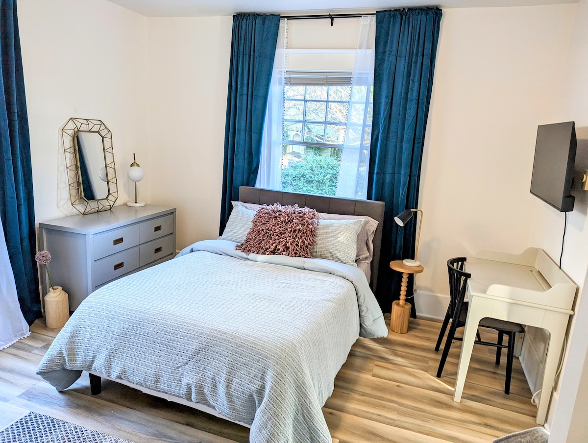 Welcome to our relaxing and private studio style apartment! It is centrally located in a quiet neighborhood in North Tacoma. It is a 5 minute drive to the University of Puget Sound, and 10 minute drive to UWT and the Ruston waterfront. It has a large kitchen and washer and dryer. The main room boasts a queen bed, sofa, smart TV, dining area, walk-in closet and a full bathroom. This apartment has all the comforts of home you need so you can have a relaxing visit to Tacoma.