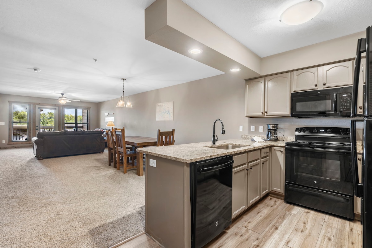 *MARCH SPECIAL $20 SIX TICKETS AVAILABLE* NO STEPS. SDC is open and Spring is around the corner. We have a Beautiful 2-bedroom, 2 bath condo, with ample parking, right outside your front door. We have a large private deck with a breathtaking view of Table Rock Lake, and the Ozark Mountains. The Cardinals love to entertain. We are also a short 3 minutes' drive to Silver Dollar City. We have great trails, and lake side fishing all along our lakefront. Some trails are a little rough.