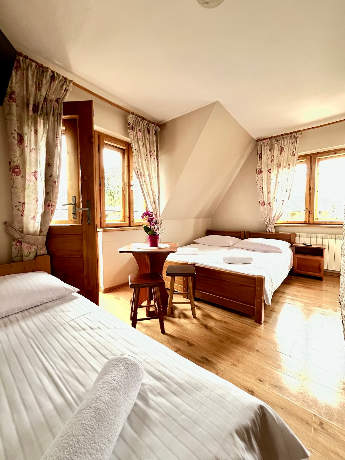 Pokój de luxe z tarasem dla 2osób z możliwością dostawki. Znajduję się na parterze, budynku posiada prywatne wejście a na zewnątrz przed pokojem są meble ogrodowe przynależne do pokoju. Pokój wyposażony jest w łóżko małżeńskie oraz rozkładaną sofę, szafę, tv, mini aneks kuchenny w którym znajduję się lodówka, czajnik, talerze, sztućce oraz łazienka. Goście mają dostęp do kuchni letniej, parkingu monitorowanego, wifi, miejsca do grillowania oraz placu zabaw dla dzieci.