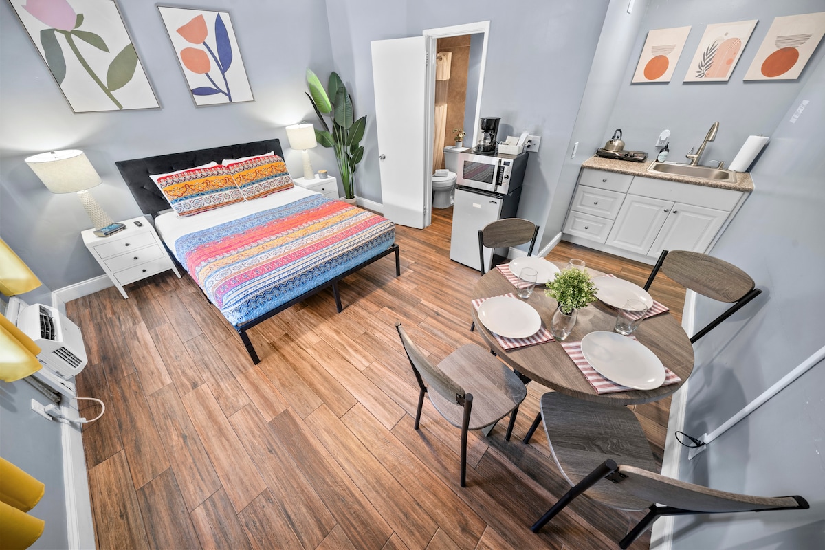 Luxurious Private Studio w/ Private Entrance (440 sq ft- can fit 3 people/2 cars) is attached to our home & 1.7 miles from beach & adjacent to Ft Lauderdale. Park under the covered carport. 1 Queen Bed (& 1 Queen Size-Blow Up Mattress), 1 Bath, Kitchenette, Fiber Optic Wifi, Flat Screen TV (140 channels), Impact Windows, Huge Closet, Fan/light, AC w/ remote, Desk, Chair, fold up/down Table for eating w/ chairs, small Fridge, Microwave, Toaster Oven, Foreman Grill, Hot Plate Stove, Coffee Maker.
